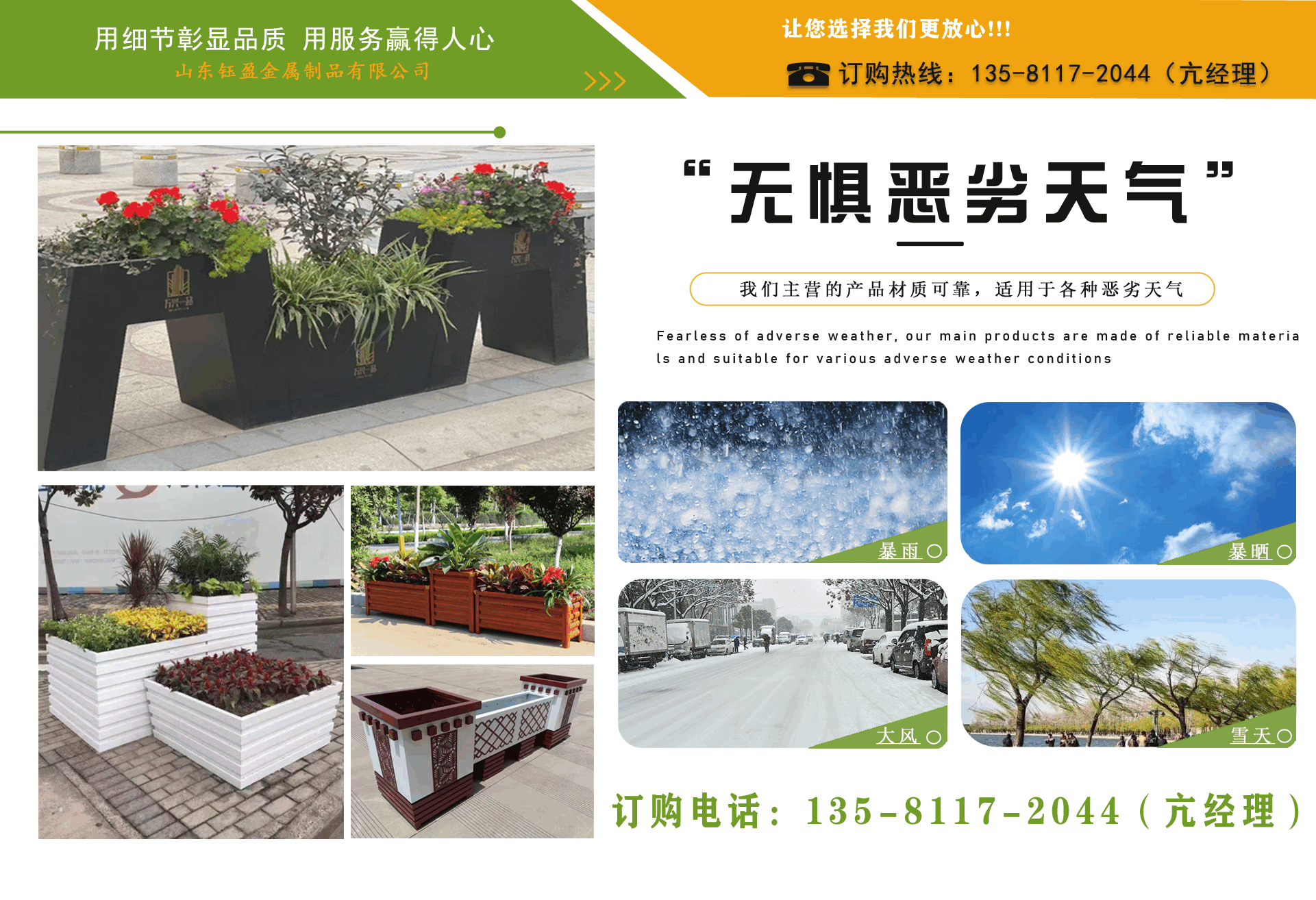 山東鈺盈金屬制品有限公司主營鍍鋅板花箱,道路隔斷花箱,定制花箱,戶外道路花箱,花箱座椅等產(chǎn)品,產(chǎn)品結(jié)構(gòu)合理、性能優(yōu)良,具有強度高、耐腐蝕、抗老化、隔熱隔音、節(jié)約能源、外形美觀、使用壽命長等優(yōu)點,深受國內(nèi)外客戶認可?! ∥覀兏鶕?jù)客戶所在城市的文化特征,制造出符合當(dāng)?shù)爻鞘形幕瘹庀⒌淖匀涣Ⅲw、觀賞性強的花箱產(chǎn)品成為城市里一道靚麗的風(fēng)景線。 公司實行誠實、公正、守信、價格合理、平等互利?! 」緫{借雄厚經(jīng)驗實力,恪守誠信為本的原則,得到了眾多客戶的信賴,并在業(yè)界獲得良好的口碑。建立了穩(wěn)固的合作關(guān)系,隨著業(yè)務(wù)的不斷發(fā)展和壯大,合作伙伴的范圍也在不斷擴大。我們熱情盼望與您的合作,為社會的可持續(xù)發(fā)展獻上一份努力。...